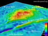 The Zenith Plateau has a dimension of about 330 km wide in the east-west direction and about 220 km in the north-south direction. The plateau is relatively deep with its shallowest point at 1670 m and gently deepening towards the Wharton Basin in north at around 5000 m. The Wallaby-Zenith Fracture Zone forms an escarpment along the southern margin of the plateau with a steep drop of between 2000 to 3000 m into a narrow trough with depths close to 6000 m. This narrow trough separates the Zenith Plateau from the adjacent Perth Abyssal Plain to the south.